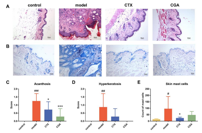 2、綠原酸顯著減輕了MRL/lpr小鼠的表皮層損傷和真皮肥大細胞數(shù)量,表皮層增厚和角化過度的發(fā)生率顯著降低。