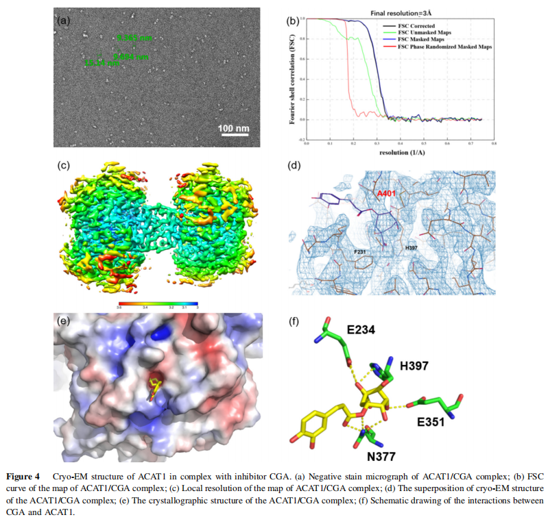 4、使用cryo-EM單顆粒分析研究ACAT1/綠原酸復(fù)合物的結(jié)構(gòu),數(shù)據(jù)在Thermo Fisher Titan Krios G3i電子顯微鏡上收集,使用MotionCor2進行圖像對齊和求和,使用CTFFIND4.1進行CTF估計,使用RELION3.1進行粒子挑選和分類。