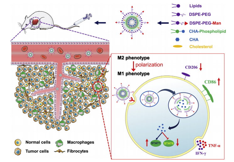 CHA封裝的Man-PEG-Lipo示意圖,該脂質(zhì)體通過(guò)主動(dòng)靶向表達(dá)甘露糖受體的TAMs增強(qiáng)腫瘤積聚,并促進(jìn)TAMs的極化用于癌癥免疫治療