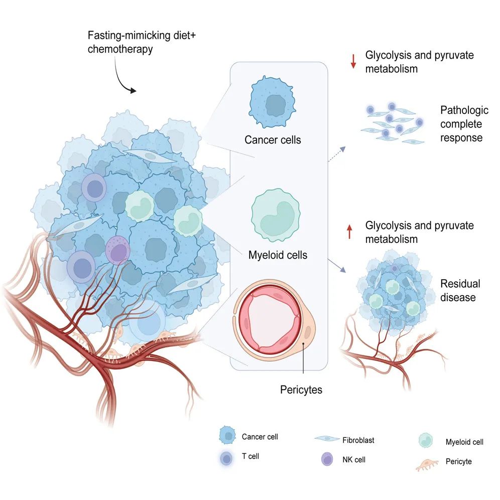 研究結(jié)果顯示,患者在化療基礎(chǔ)上接受每個(gè)周期3周、每周5天的FMD飲食,配合化療(±二甲雙胍)可達(dá)到56.6%的pCR率,已接近免疫+化療新輔助治療在關(guān)鍵臨床研究中的療效,患者的3年無(wú)事件生存(EFS)率則高達(dá)86.7%,明顯優(yōu)于歷史數(shù)據(jù);多組學(xué)分析結(jié)果顯示,F(xiàn)MD下調(diào)腫瘤糖酵解能力和丙酮酸代謝水平,可能是實(shí)現(xiàn)臨床獲益的關(guān)鍵機(jī)制。