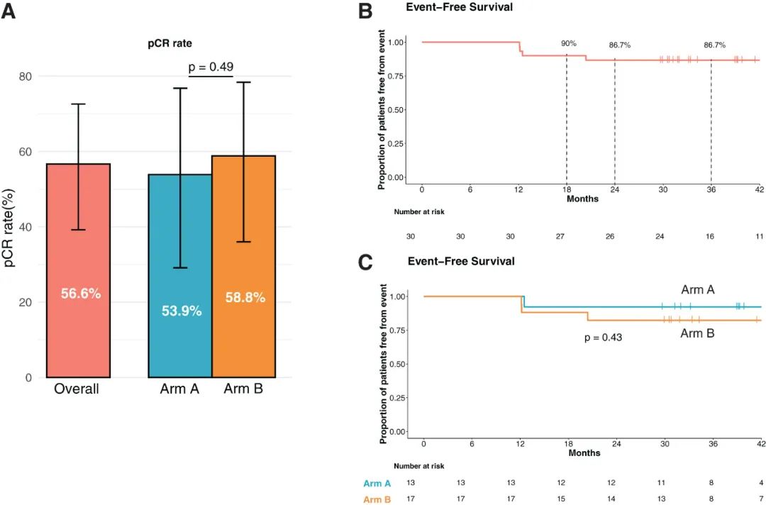 長(zhǎng)期預(yù)后的顯著改善,更是FMD+新輔助化療帶來(lái)的驚喜:中位隨訪時(shí)間超過(guò)3年(39.3個(gè)月)后,30名入組患者僅有4名出現(xiàn)復(fù)發(fā),36個(gè)月EFS率高達(dá)86.7%,和總生存(OS)率一起超過(guò)了既往單純新輔助化療的水平(3年EFS率約65%,OS率約80%)