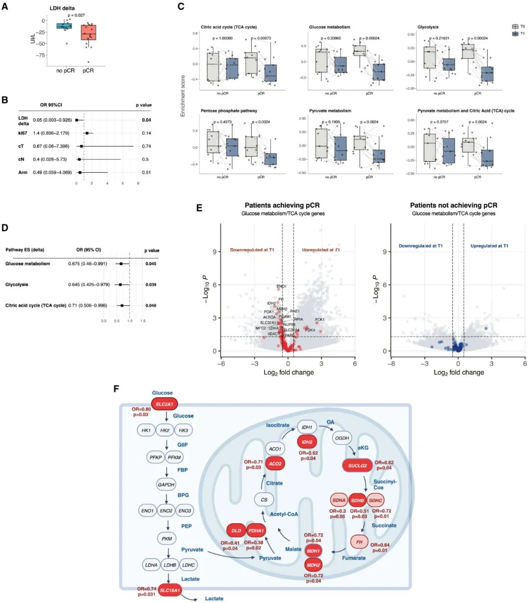 最后,對(duì)手術(shù)切除腫瘤樣本的單細(xì)胞RNA測(cè)序和轉(zhuǎn)錄組學(xué)分析顯示,癌細(xì)胞及部分糖酵解水平較高瘤內(nèi)細(xì)胞(如周細(xì)胞)的糖酵解能力和丙酮酸代謝水平,都在FMD+新輔助化療開(kāi)始后不久就明顯下調(diào),腫瘤微環(huán)境的免疫浸潤(rùn)同步發(fā)生了顯著改善,糖酵解早期下調(diào)也是患者經(jīng)治療達(dá)到pCR的獨(dú)立預(yù)測(cè)因子。