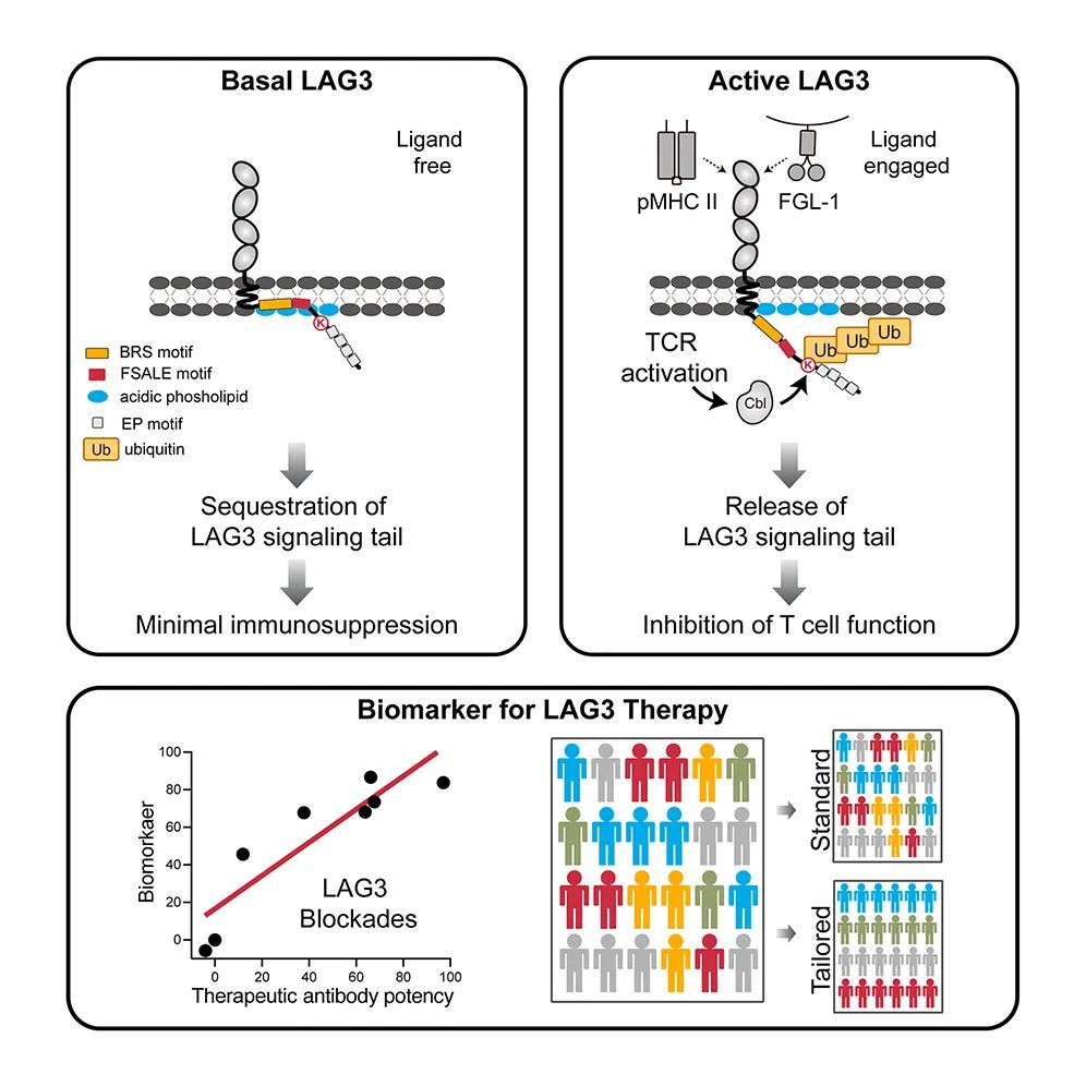 LAG3 的泛素化由 E3 連接酶 c-Cbl 和 Cbl-b 共同介導(dǎo),破壞了其膜近端富含堿性殘基序列的膜結(jié)合,從而使 LAG3 的胞質(zhì)尾穩(wěn)定在膜分離構(gòu)象中,從而能夠進(jìn)行信號(hào)傳導(dǎo)。此外,LAG3 的泛素化對(duì)于 LAG3 在體內(nèi)介導(dǎo)的抗腫瘤免疫抑制至關(guān)重要。LAG3 治療性抗體始終抑制 LAG3 泛素化,這與它們的檢查點(diǎn)阻斷效應(yīng)相關(guān)。進(jìn)一步的患者隊(duì)列分析表明,LAG3/CBL 共表達(dá)可作為 LAG3 阻斷反應(yīng)的生物標(biāo)志物。