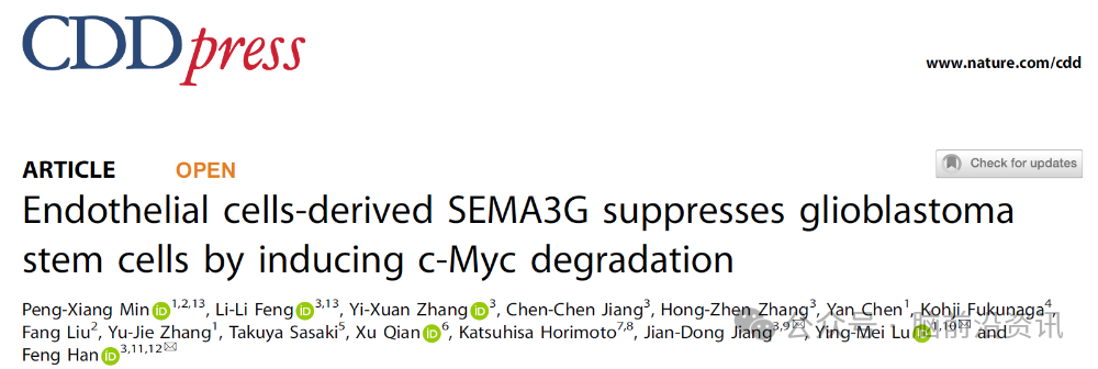 近日,南京醫(yī)科大學(xué)研究團隊在Cell Death & Differentiation雜志發(fā)表題為Endothelial cells-derived SEMA3G suppresses glioblastoma stem cells by inducing c-Myc degradation的研究論文,闡明了內(nèi)皮細胞來源的SEMA3G通過誘導(dǎo)干細胞關(guān)鍵標(biāo)志物c-Myc的降解破壞GSCs干性維持的內(nèi)在驅(qū)動力,從而抑制膠質(zhì)母細胞瘤的惡性進展。這一研究揭示了靶向SEMA3G-c-Myc軸可能為膠質(zhì)母細胞瘤患者提供新的治療策略。