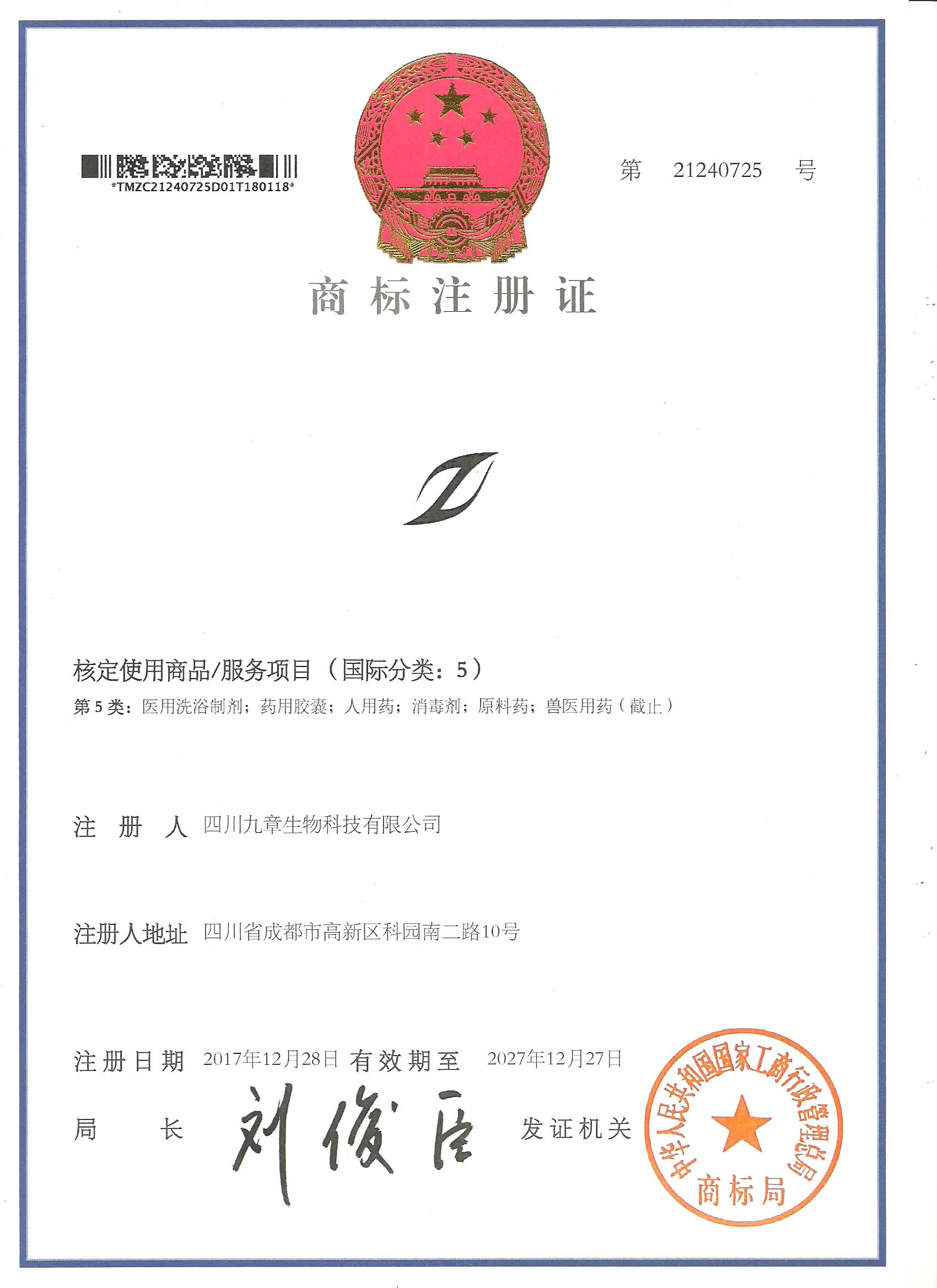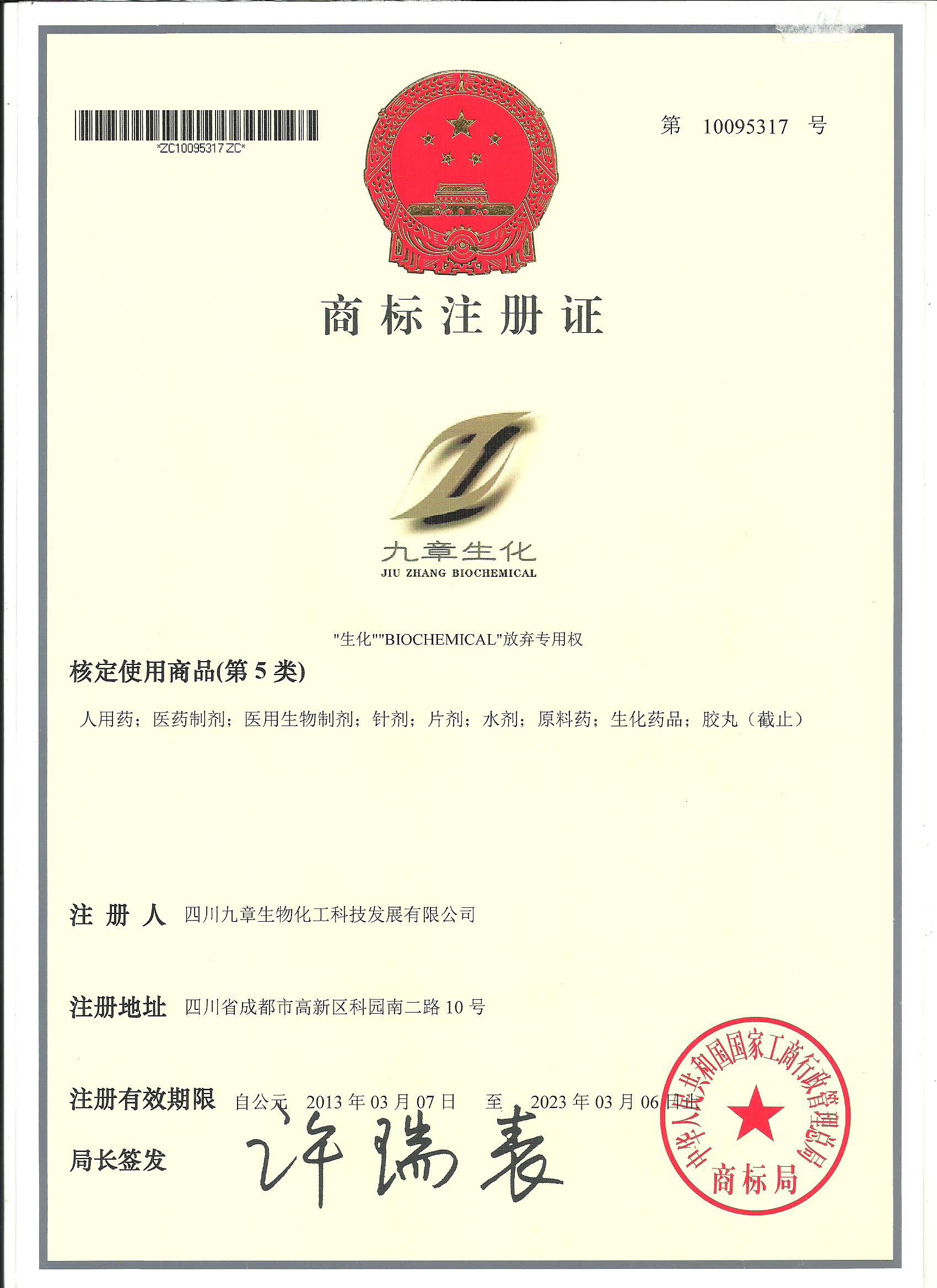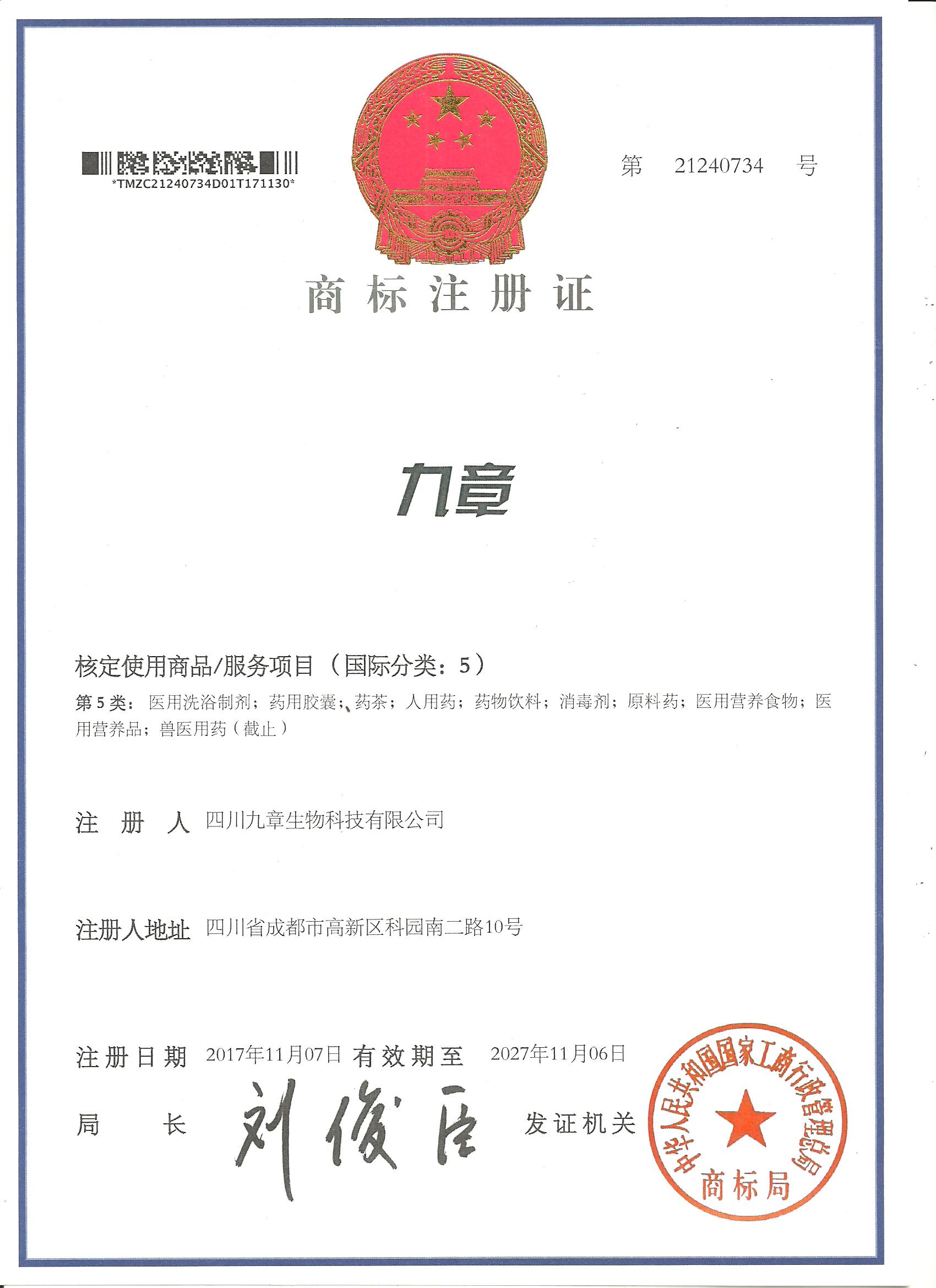 九章生物在人用藥、原料藥、醫(yī)療美容等多個重要領(lǐng)域注冊并獲得有效商標(biāo)權(quán)43項,包括文字或圖案等。