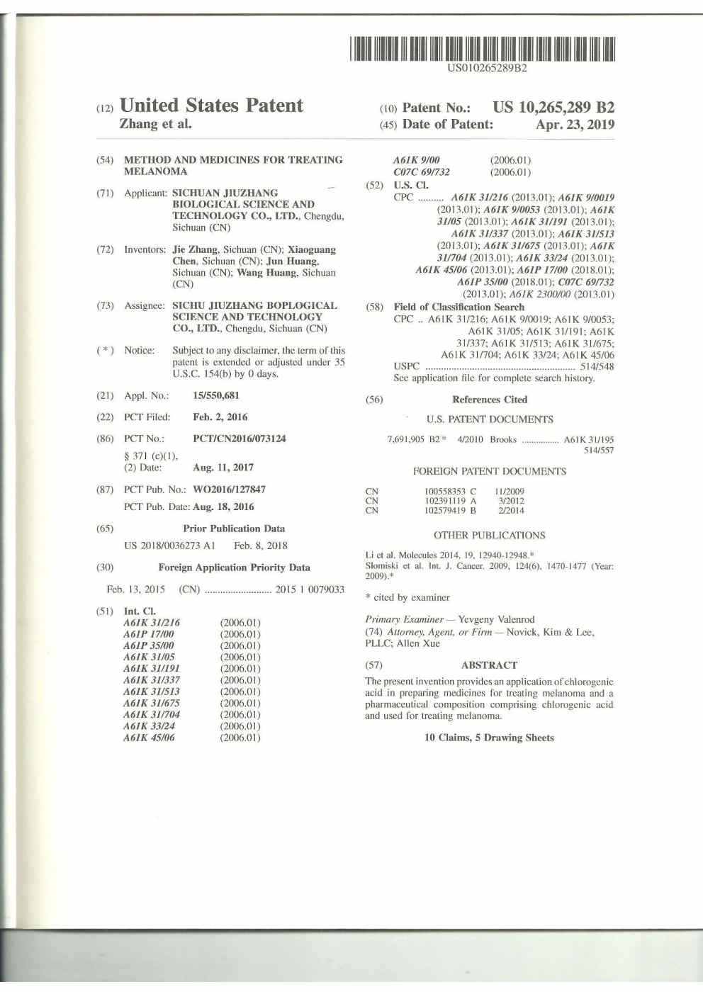 • 美國-PCT-CN2016-073124 綠原酸在制備治療黑色素瘤的藥物中的用途及治療黑色素瘤的藥物