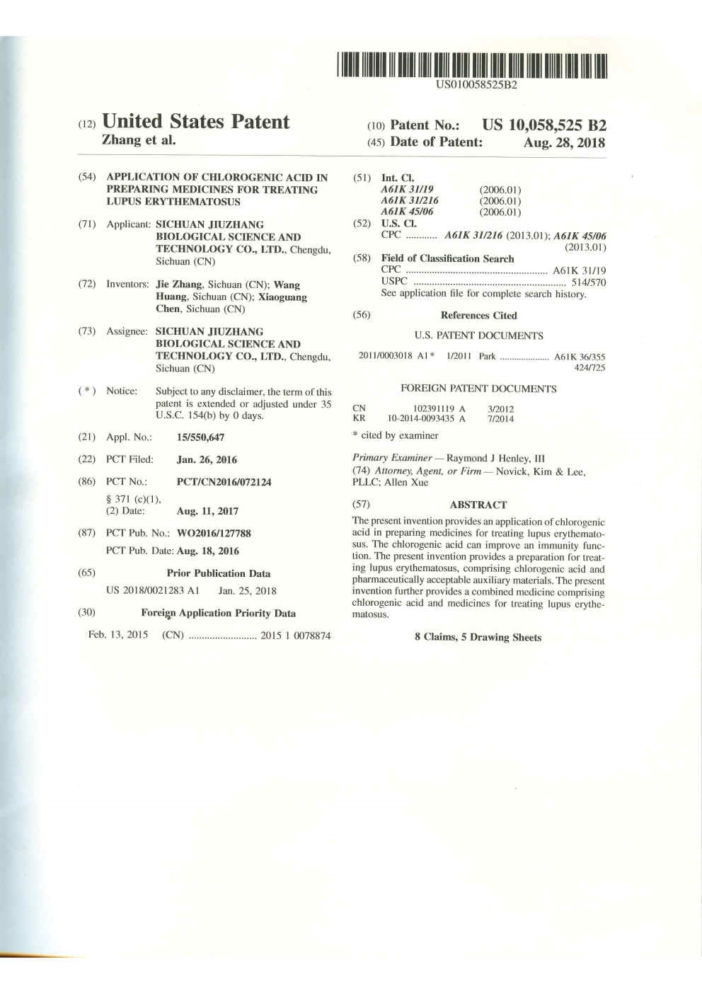• 美國-PCT-CN2016-072124 綠原酸在制備治療紅斑狼瘡的藥物中的用途