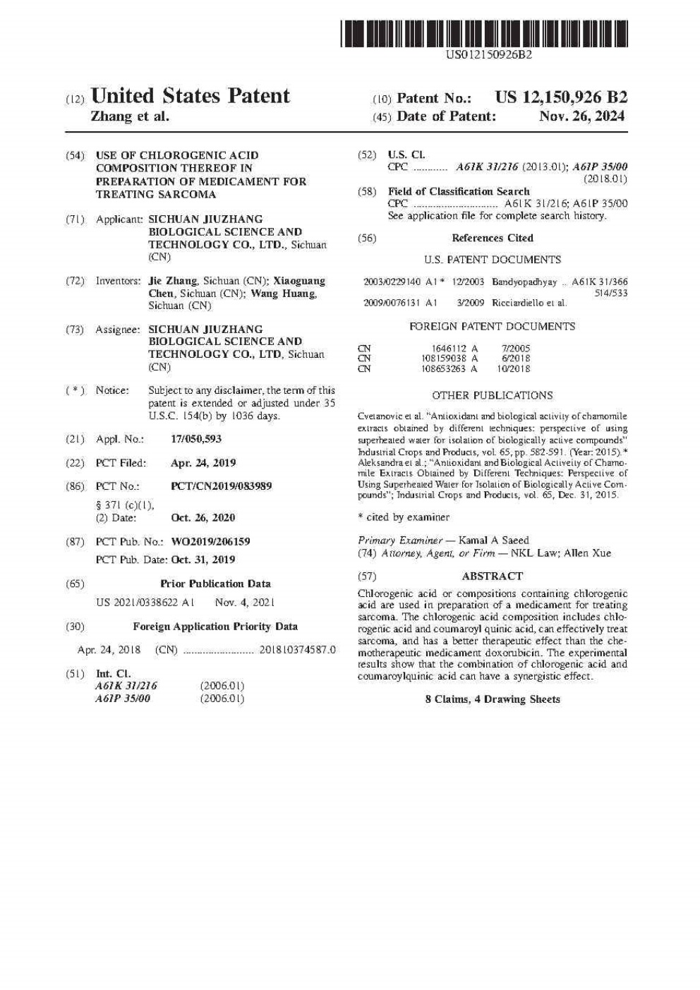 • 美國-PCT-CN2019-083989 綠原酸及其組合物在制備治療肉瘤的藥物中的用途