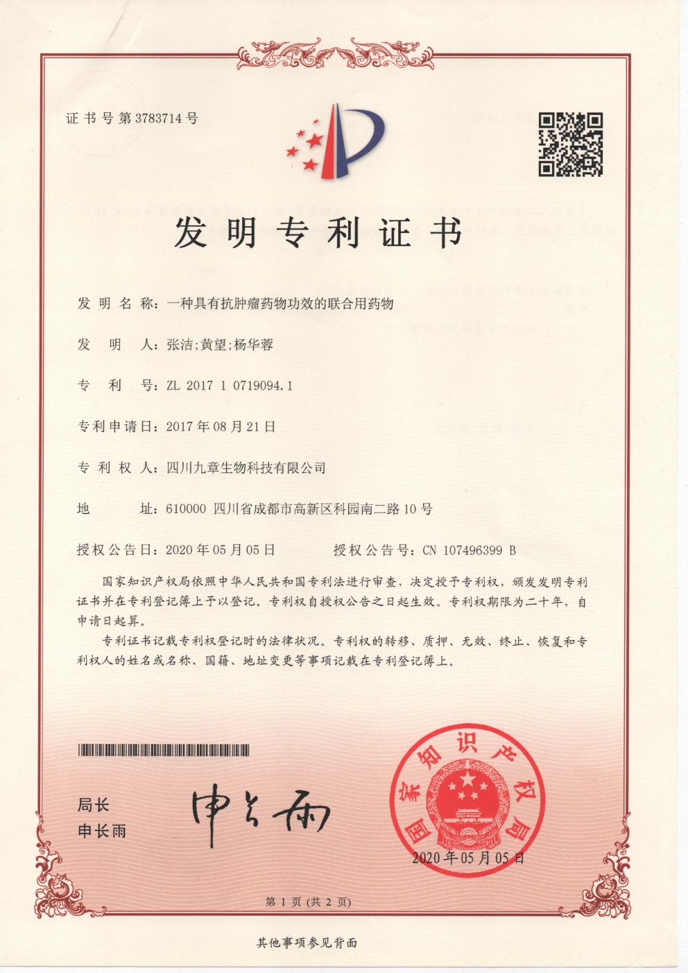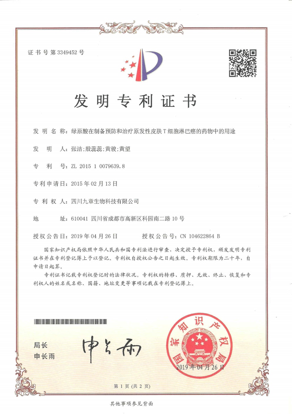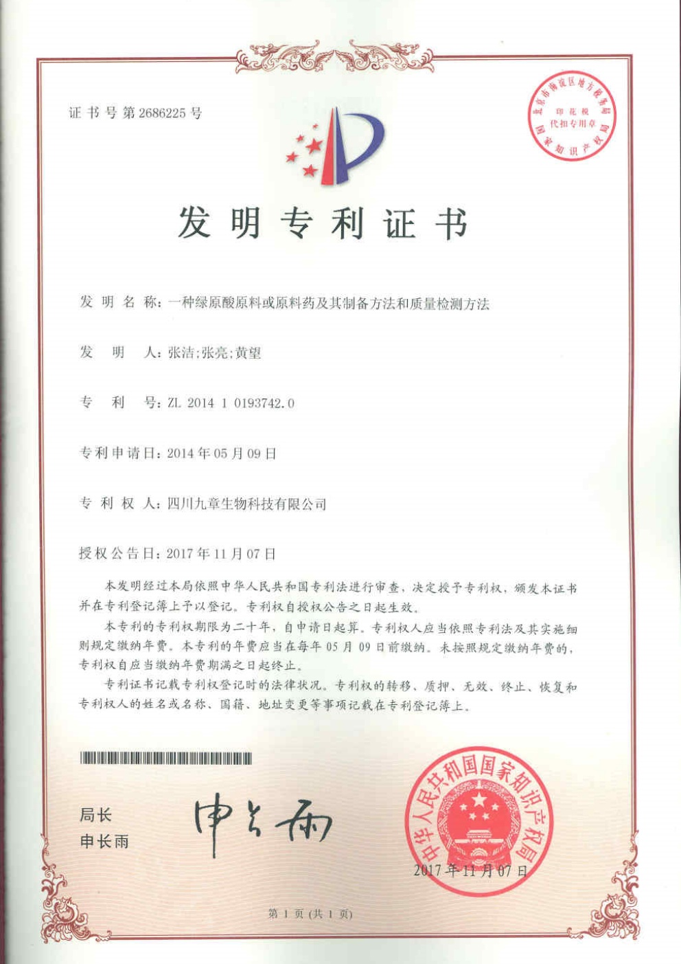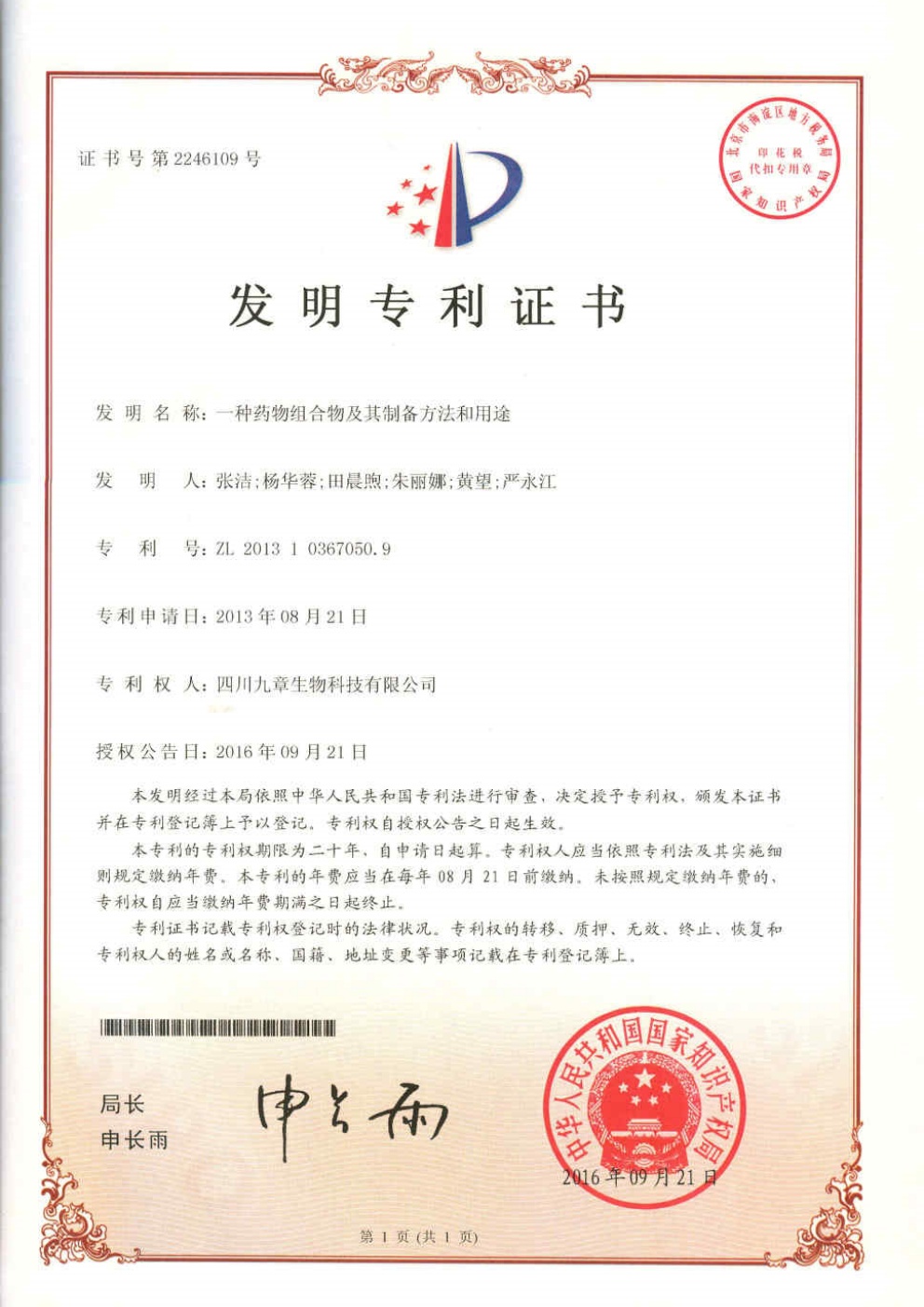 截止2026年03月01日,九章生物圍繞藥品專利保護(hù)方面已獲得國內(nèi)授權(quán)專利計53項,全部為發(fā)明專利;已獲得外國授權(quán)專利計29項,全部為發(fā)明專利,其中美國19項,歐洲5項,日本3項,韓國1項,澳大利亞1項。國內(nèi)申請中的專利6項。國外申請中的專利8項,其中美國5項,澳大利亞1項,日本1項,韓國1項。