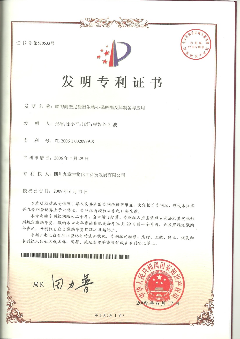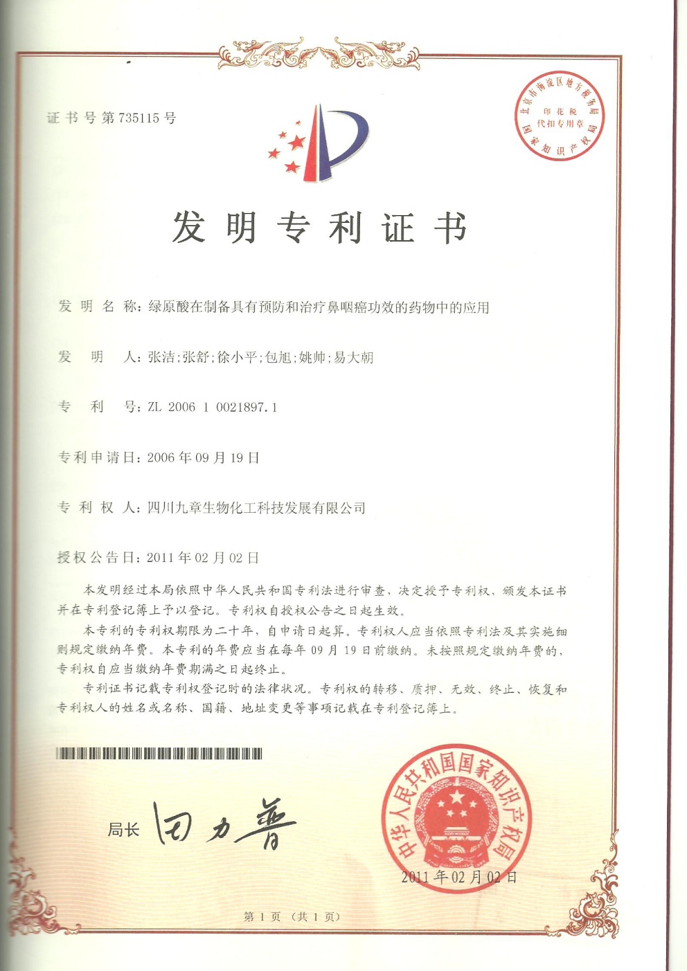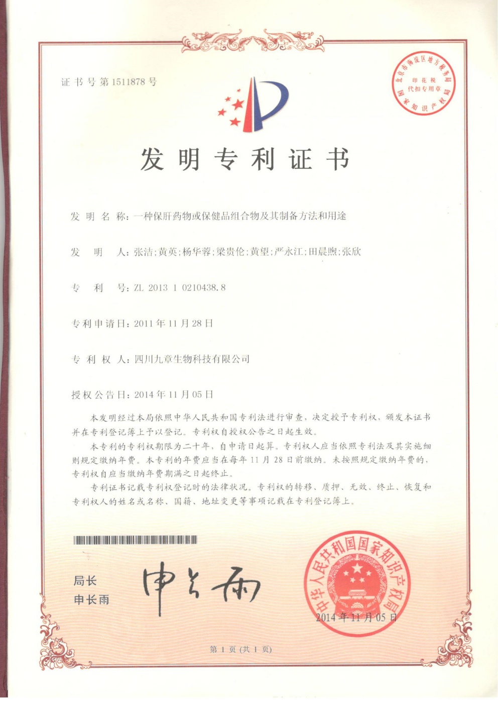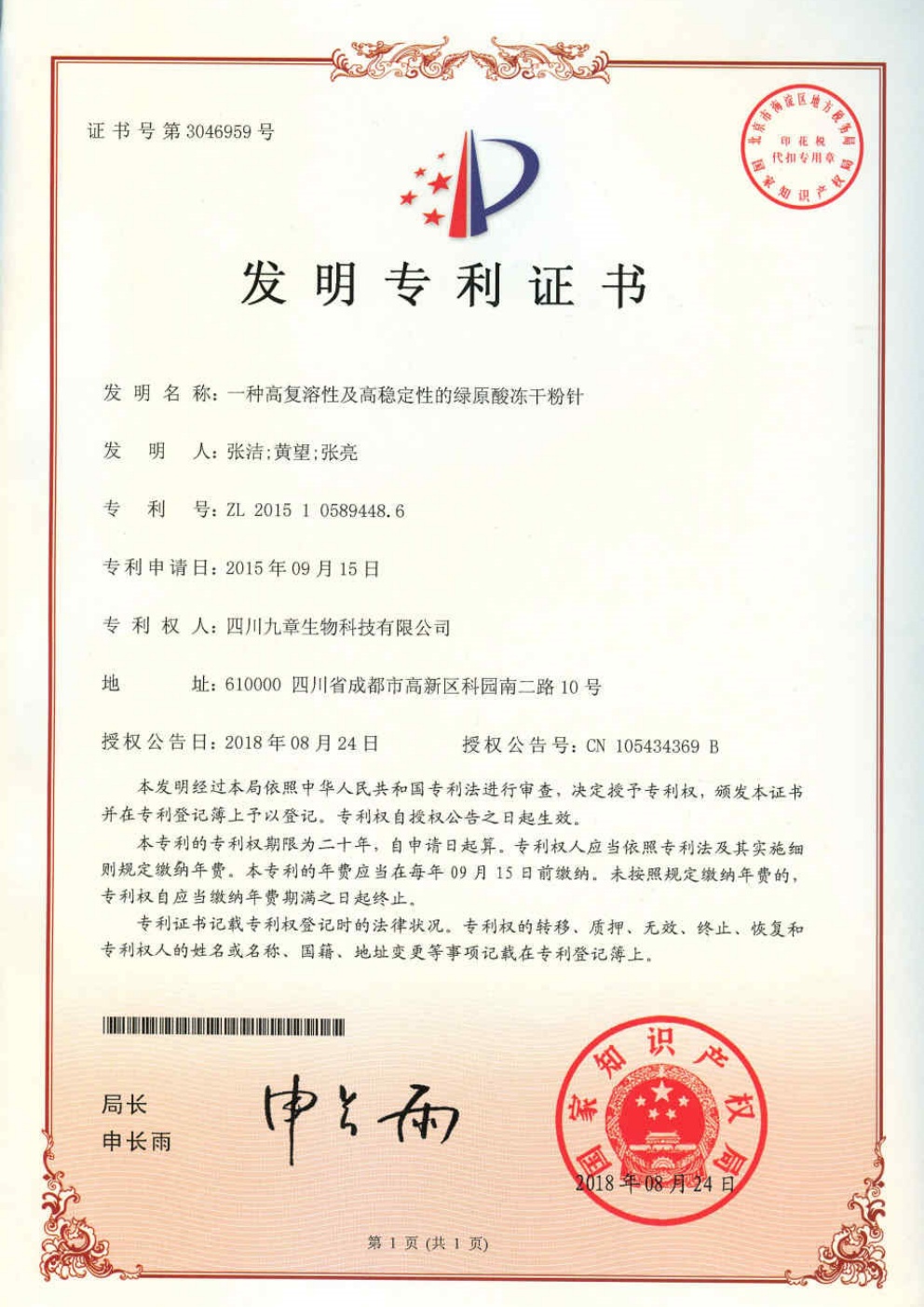 截止2026年03月01日,九章生物圍繞藥品專利保護(hù)方面已獲得國內(nèi)授權(quán)專利計53項,全部為發(fā)明專利;已獲得外國授權(quán)專利計29項,全部為發(fā)明專利,其中美國19項,歐洲5項,日本3項,韓國1項,澳大利亞1項。國內(nèi)申請中的專利6項。國外申請中的專利8項,其中美國5項,澳大利亞1項,日本1項,韓國1項。