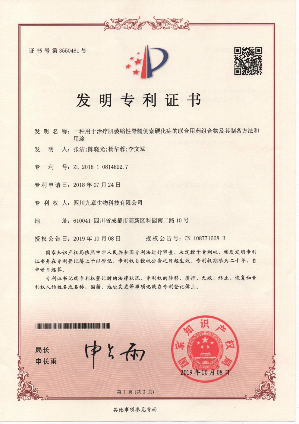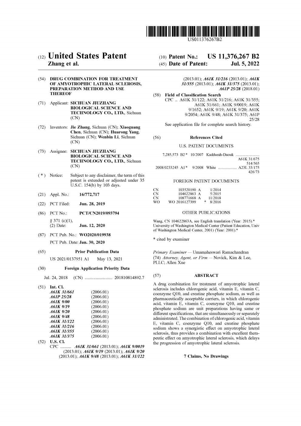 • 美國-PCT-CN2019-093794 一種用于治療肌萎縮性脊髓側(cè)索硬化癥的聯(lián)合用藥組合物及其制備方法和用途