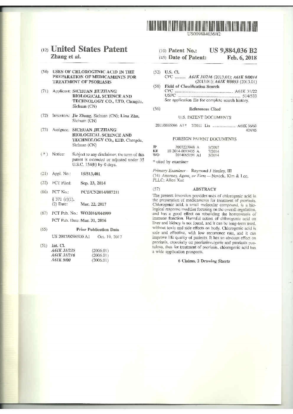 • 美國-PCT-CN2014-087211 綠原酸在制備治療銀屑病的藥物中的用途