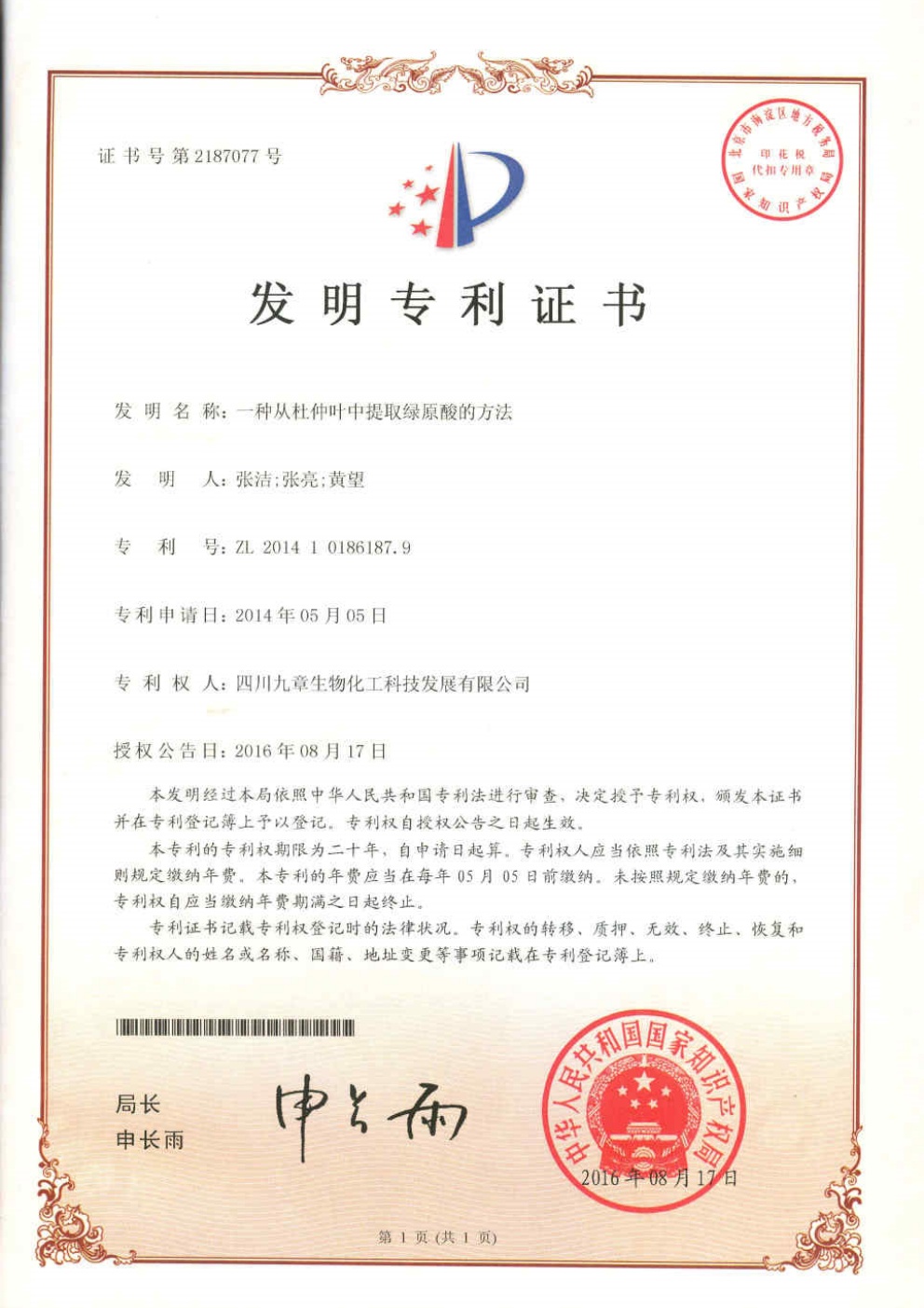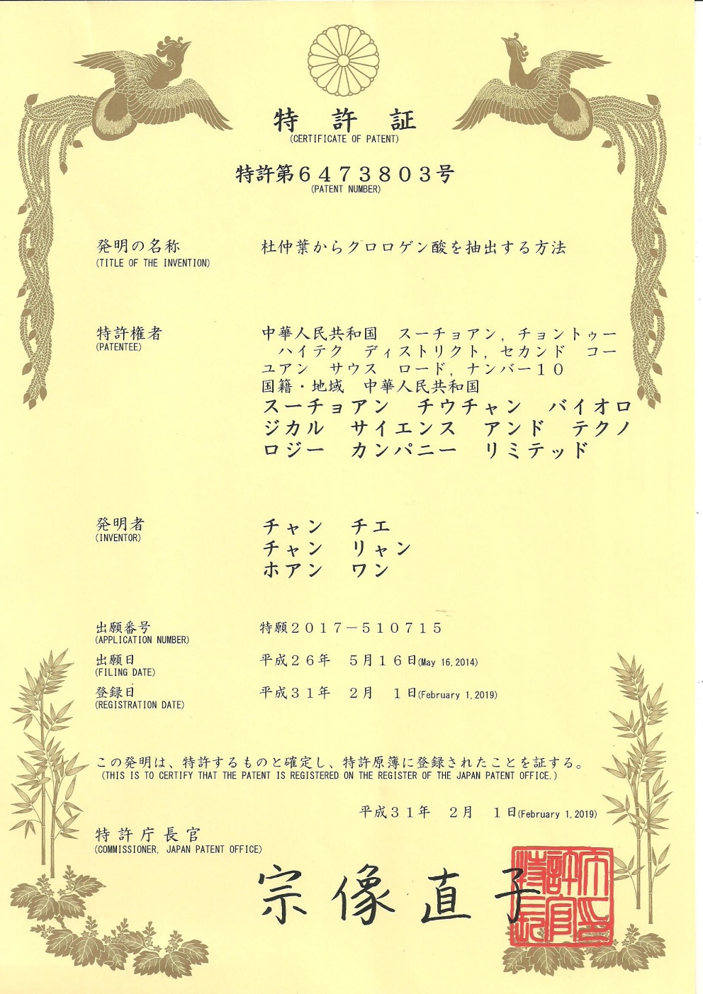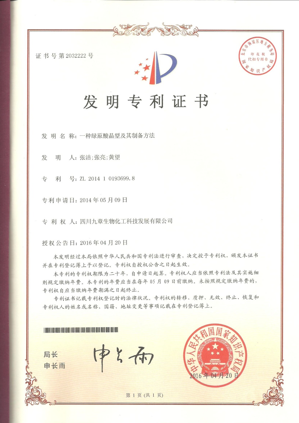 • 歐洲-PCT-CN2014-077652 一種綠原酸晶型及其制備方法