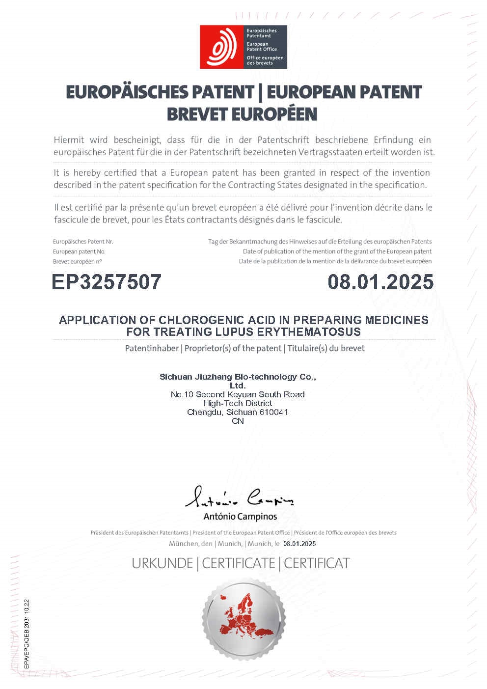 • 歐洲-PCT-CN2016-072124 綠原酸在制備治療紅斑狼瘡的藥物中的用途