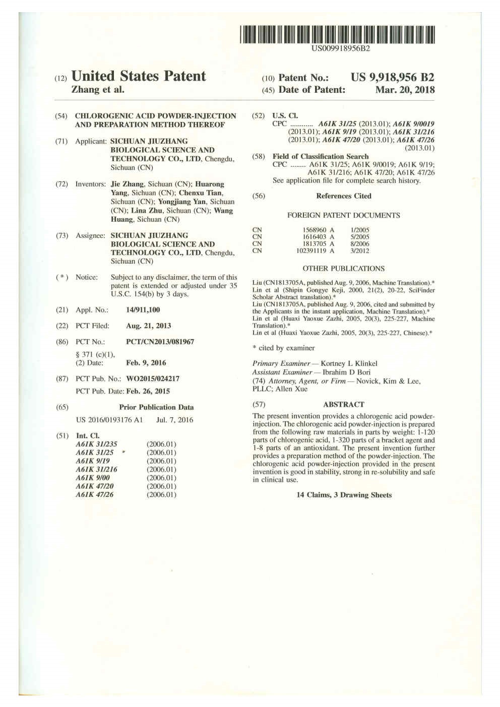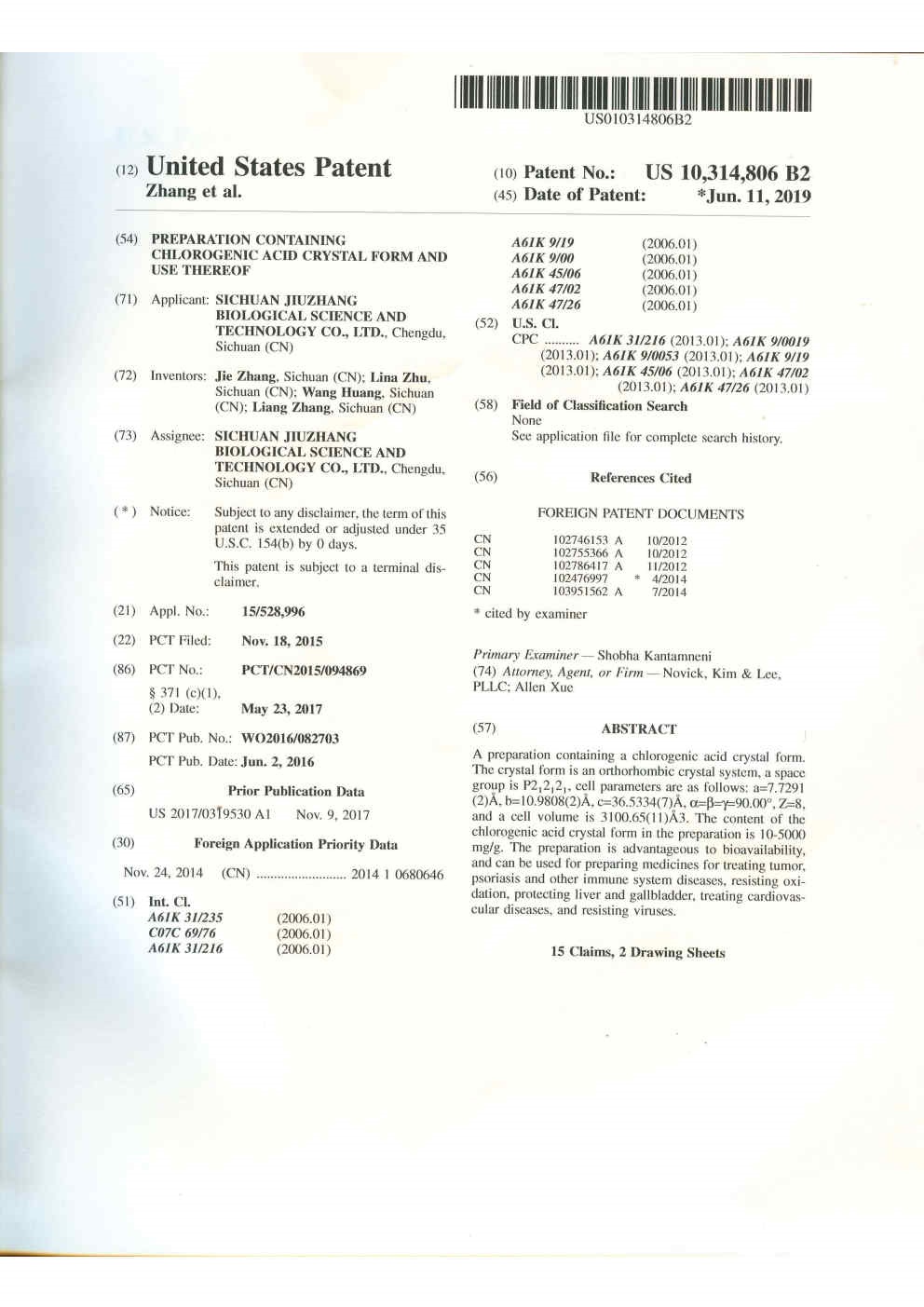 • 美國-PCT-CN2014-077652 一種綠原酸晶型及其制備方法