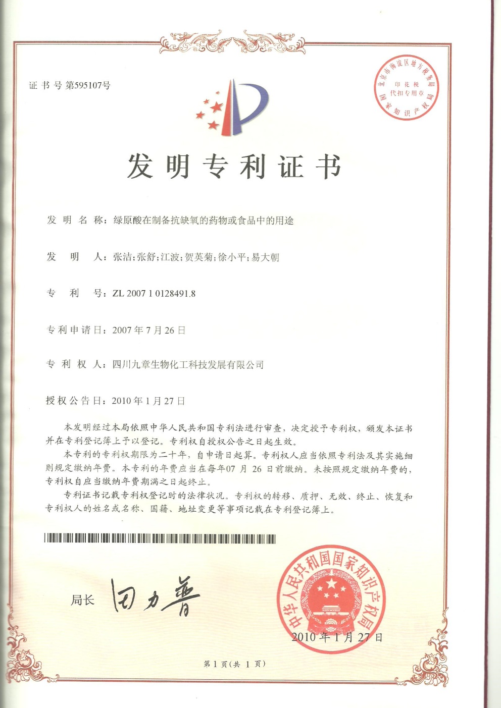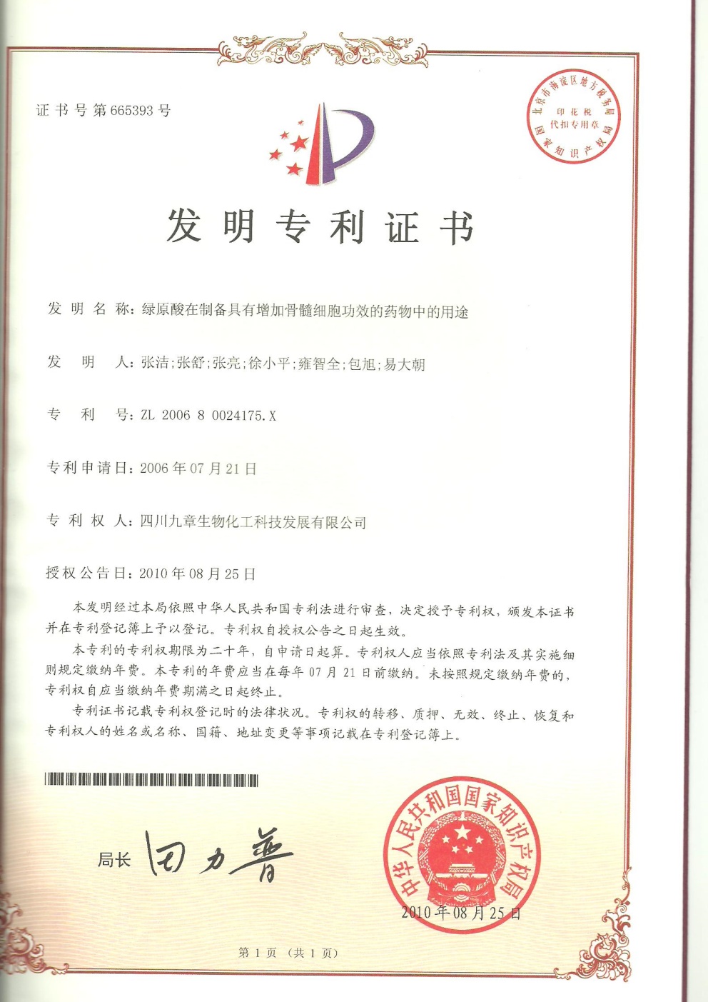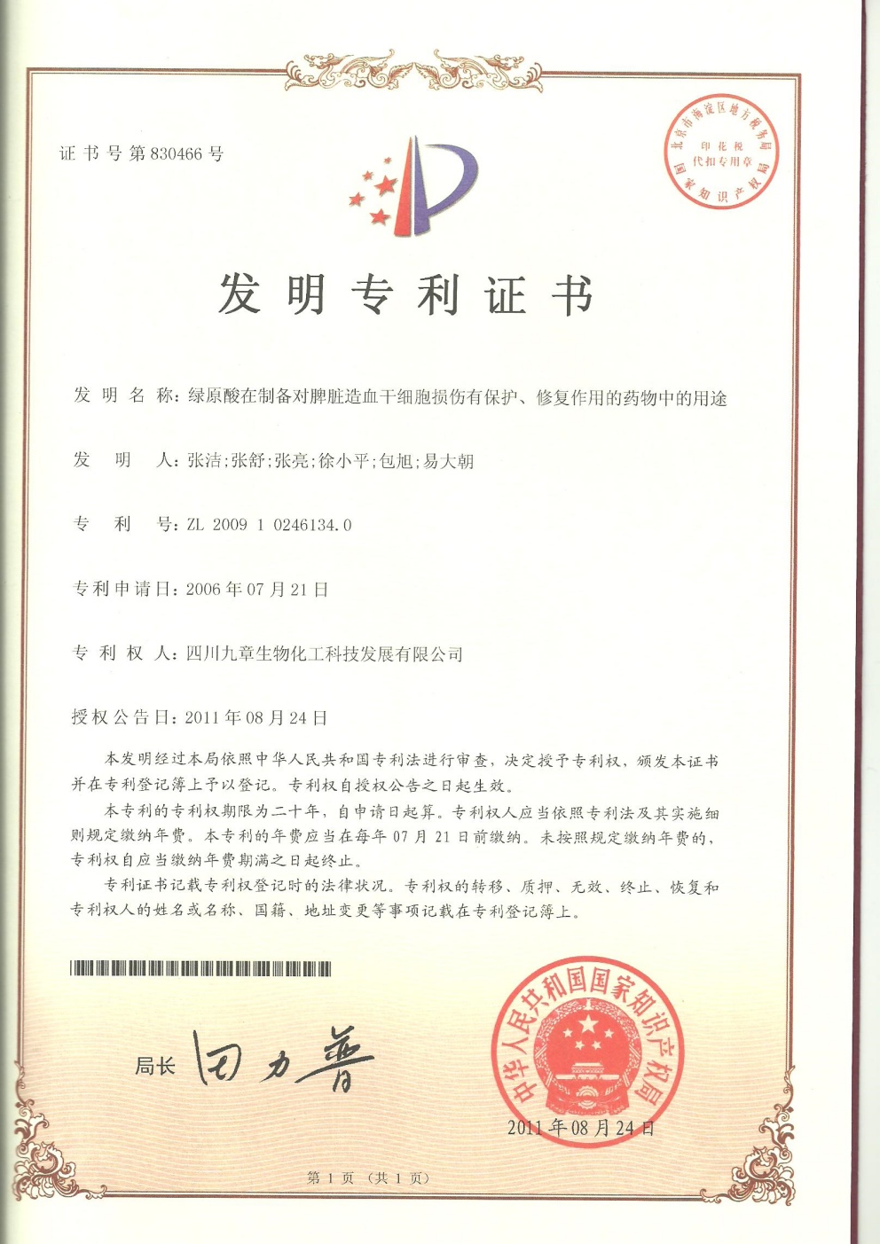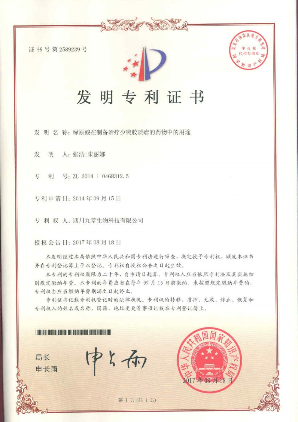 • 美國-PCT-CN2014-086536 綠原酸在制備治療少突膠質(zhì)瘤的藥物中的用途