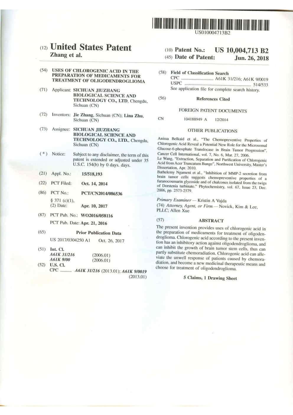 美國-PCT-CN2014-086536 綠原酸在制備治療少突膠質(zhì)瘤的藥物中的用途