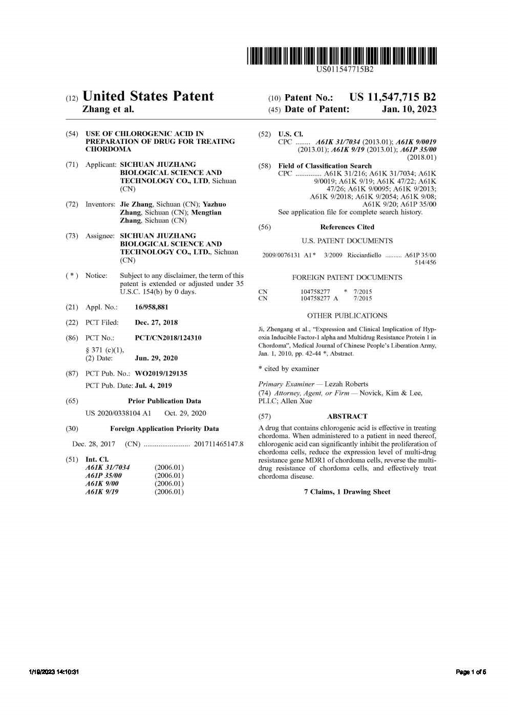 • 美國-PCT-CN2018-124310 綠原酸在制備治療脊索瘤的藥物中的用途