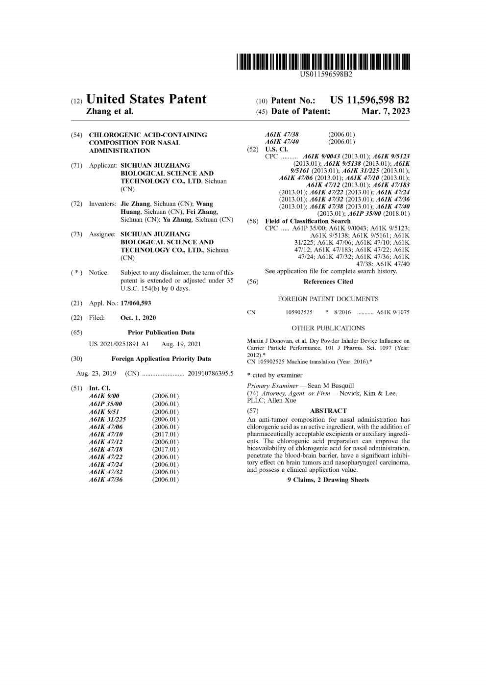 • 美國-一種含綠原酸的鼻腔給藥組合物