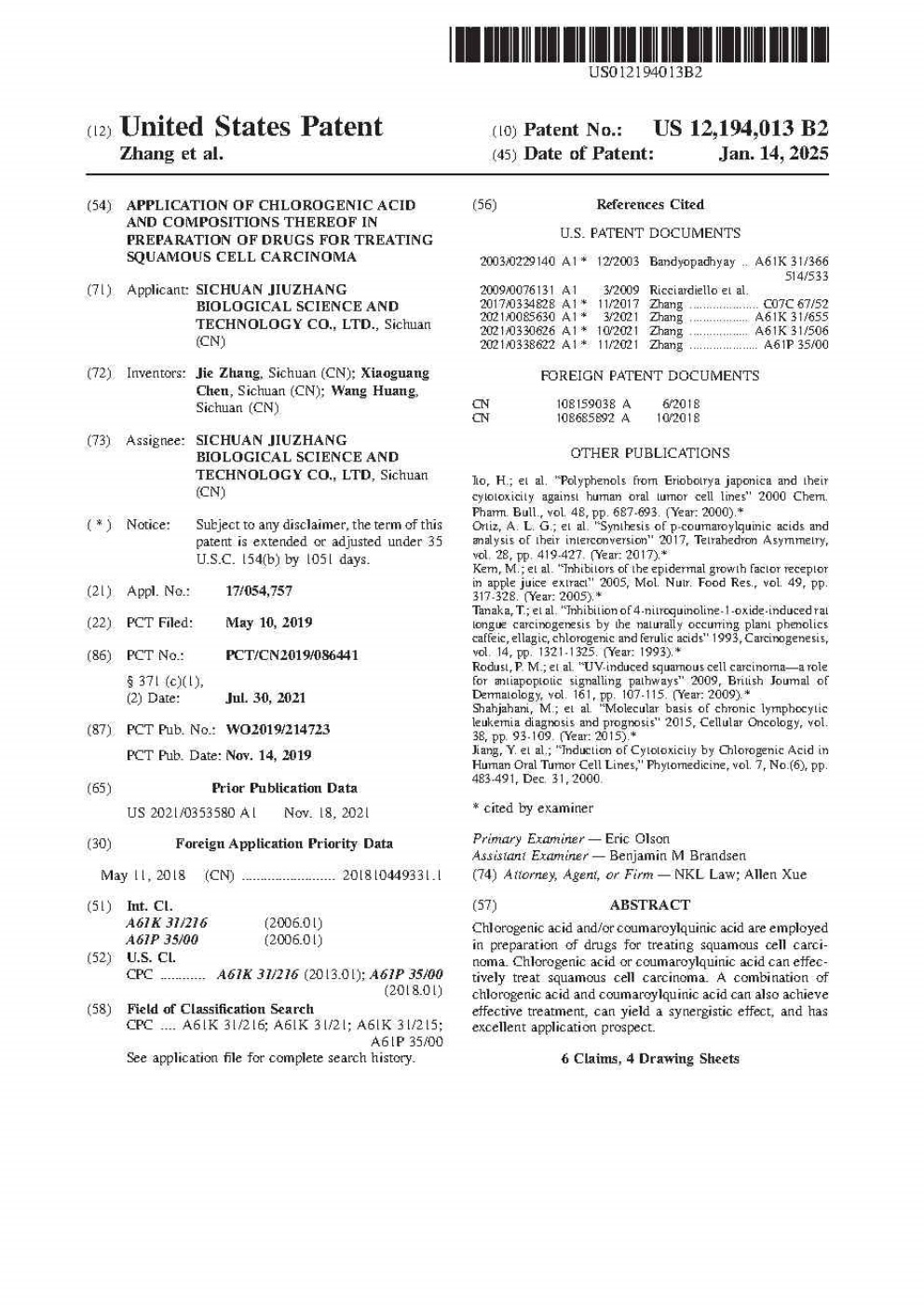 美國-PCT-CN2019086441 綠原酸及其組合物在制備治療鱗狀細(xì)胞癌的藥物中的用途