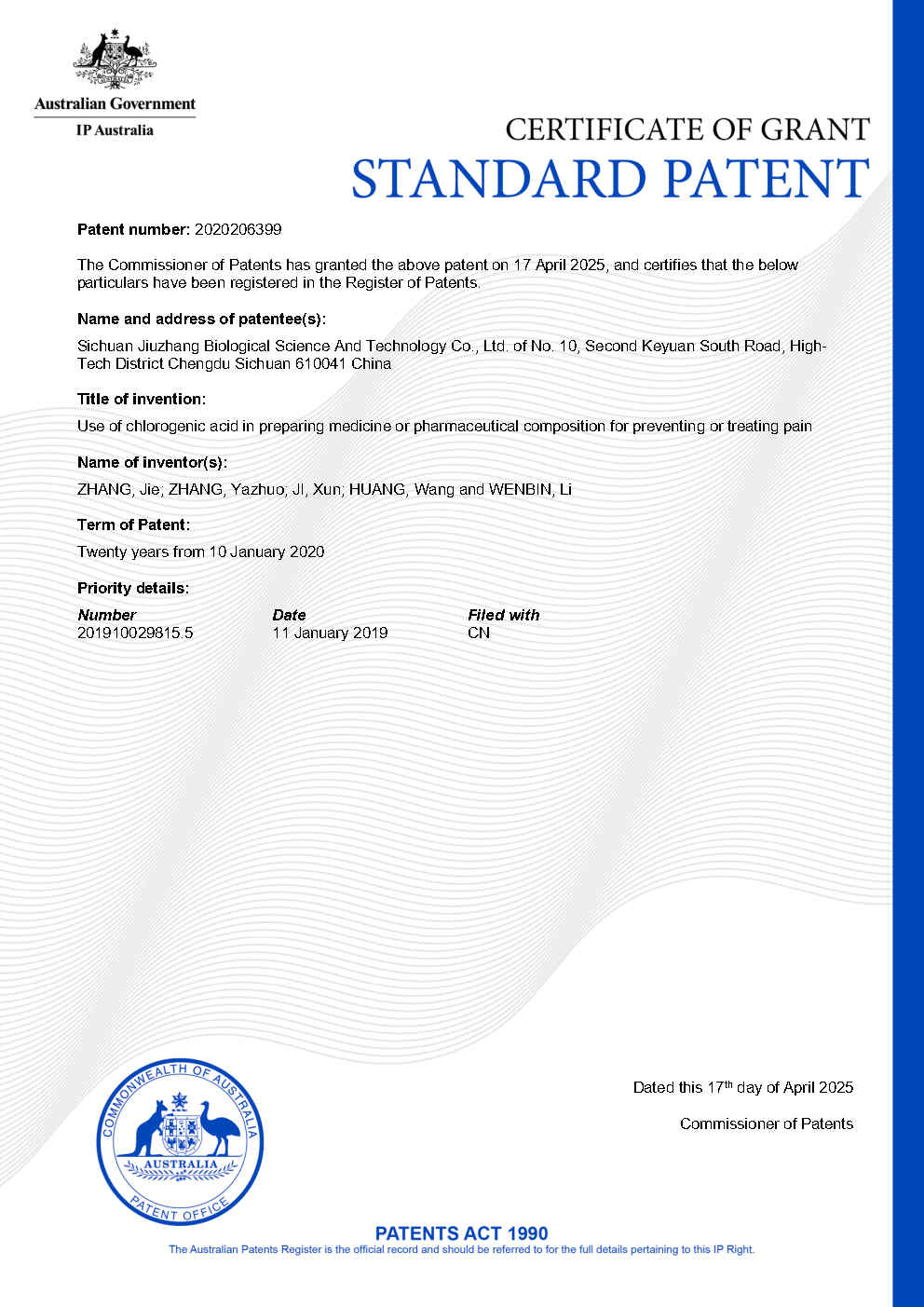 • 澳大利亞-PCT-CN2020-071345-綠原酸在制備預(yù)防或治療疼痛的藥物或藥物組合物中的用途