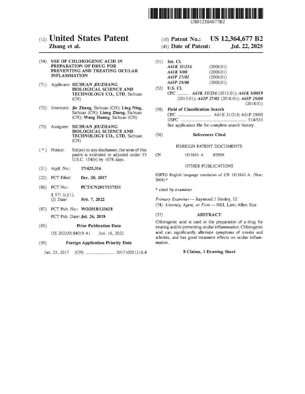 九章生物分別從關(guān)鍵治療領(lǐng)域、相關(guān)衍生物、核心工藝、新劑型、給藥途徑等方面對綠原酸申請了專利保護(hù)。