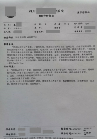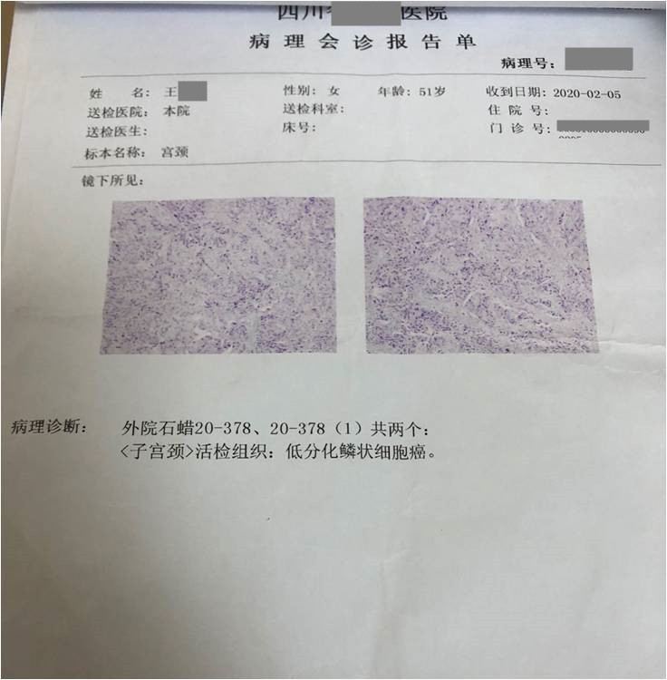 患者用藥前病理診斷:子宮頸低分化鱗狀細胞癌;隨后進行化療、放療,并同步使用注射用綠原酸;聯(lián)合治療8個月后停止化療,開始單獨使用綠原酸至2022年1月。用藥期間,多次復查,病情穩(wěn)定向好,無復發(fā)和轉移跡象,血生化指標正常,生活狀態(tài)良好。