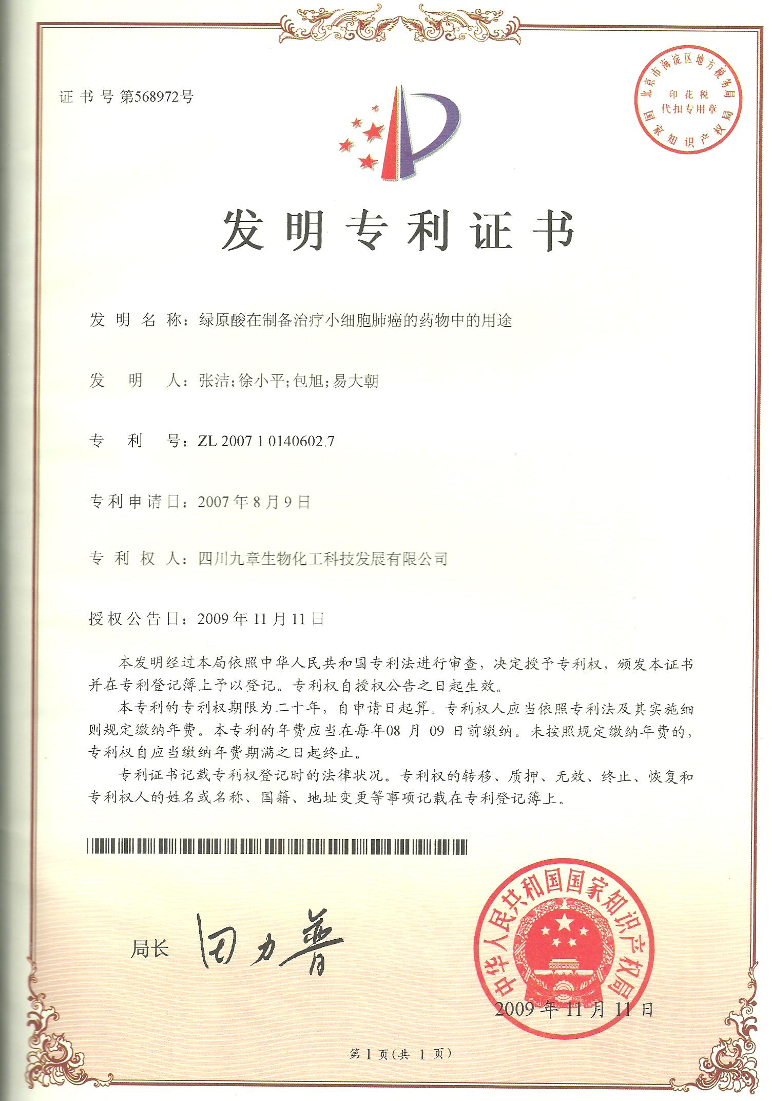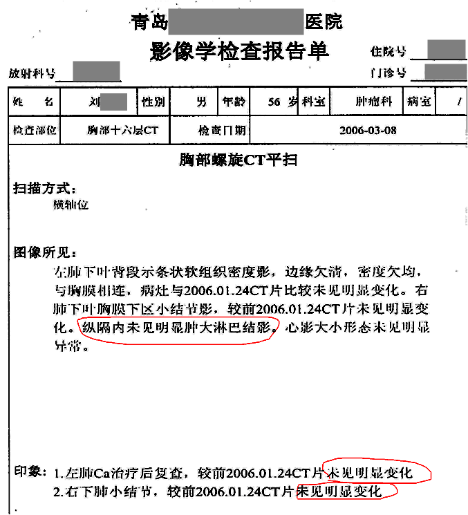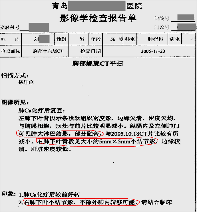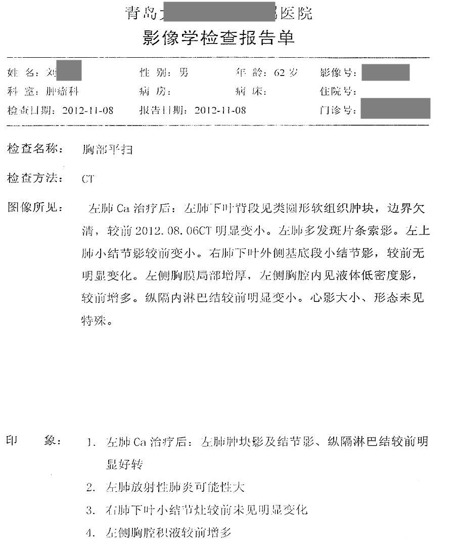 用藥前患者確診為左側(cè)小細(xì)胞肺癌,由于靠近血管無法手術(shù),只進(jìn)行化療,期間胸部CT發(fā)現(xiàn)有肺癌淋巴結(jié)轉(zhuǎn)移的可能,停止在醫(yī)院治療,隨后開始單獨(dú)使用注射用綠原酸,沒有使用其他藥物。用藥3個(gè)月后,CT顯示轉(zhuǎn)移淋巴結(jié)病灶消失。用藥7年半,期間血生化指標(biāo)基本正常,腫瘤標(biāo)志物一直在正常范圍值內(nèi),病情穩(wěn)定,目前患者生活狀態(tài)良好,與常人無異,已延長生存期13年。